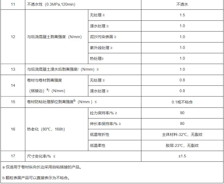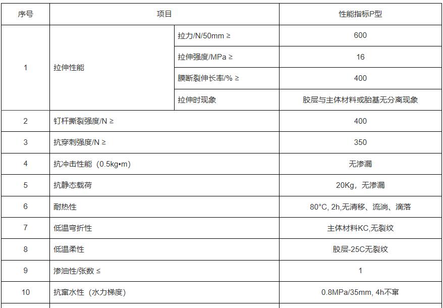 2.1材料性能: 產(chǎn)品執(zhí)行GB/T 23457-2017《預(yù)鋪防水卷材》國(guó)家標(biāo)準(zhǔn)中P類要求(表2-1)。