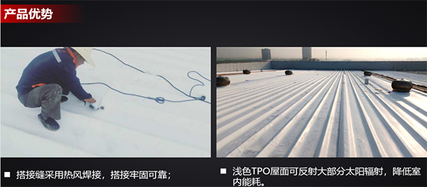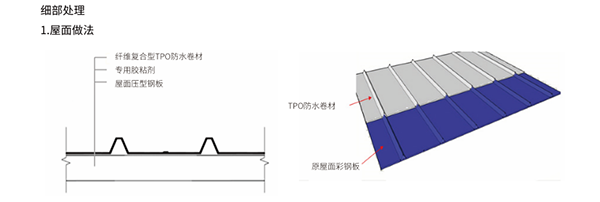2.6、TPO維修專用 產品執行標準--GB 18173.1-2012 卷材長20米寬2米;搭接邊10公分;厚度0.8+覆布;重量:0.8KG/㎡ 輔料:水泥基面用水泥粘結膠料和鋼屋面用氯丁膠、固定用壓條、鋼釘。