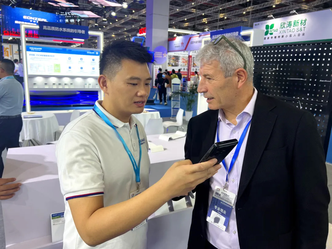 歐西盾防水位于5.2號館5016展位,由董事長王洪波帶領企業團隊參與此次展會。展會中所展示的產品十分豐富,涵蓋了 “金屬屋面防水系統”、“TPS 鋼塑一體瓦系統”、“DOB 卷涂復合系統”、“DOB 外墻防水系統”以及 “公民建防水系統” 等,充分體現了品牌的多元性。歐西盾防水依靠成熟且完備的防水理念和高品質的防水新產品,成功吸引了眾多人氣,眾多專業觀眾都被吸引過來,紛紛停下腳步進行咨詢。