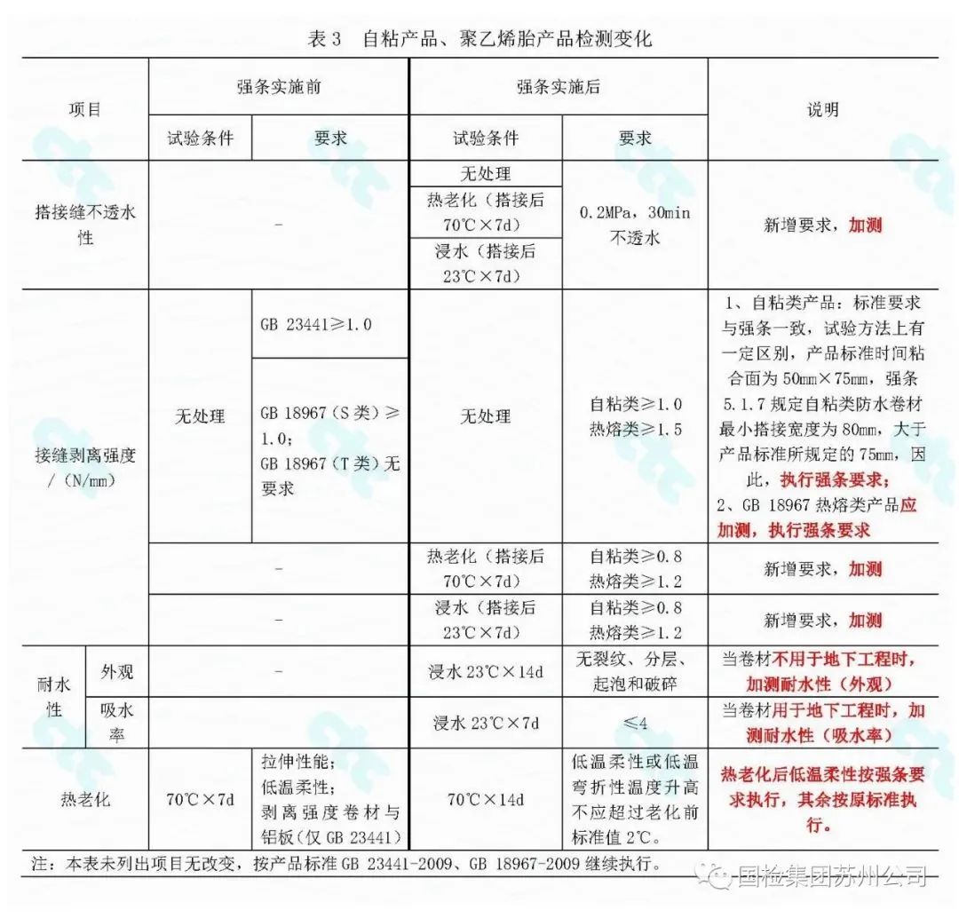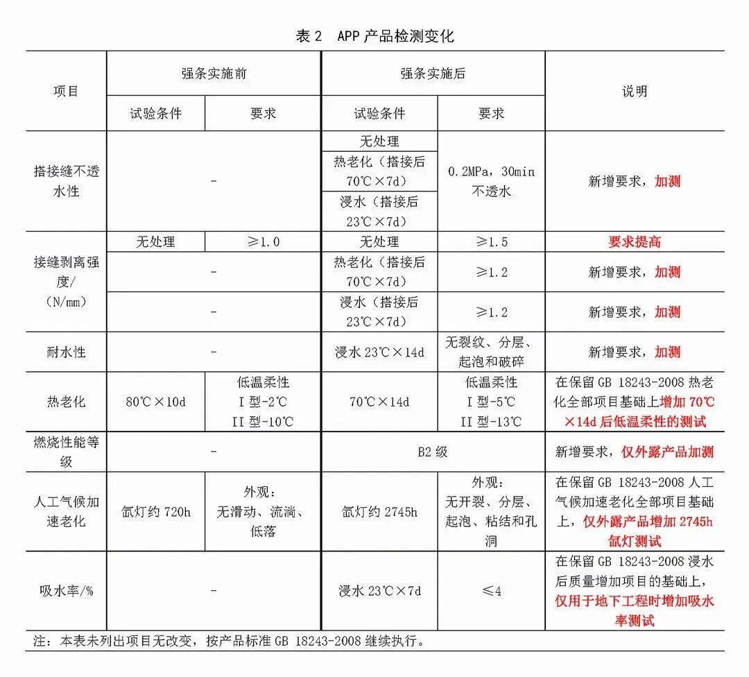 自粘聚合物改性瀝青防水卷材(執行標準為GB 23441—2009《自粘聚合物改性瀝青防水卷材》),改性瀝青聚乙烯胎防水卷材(執行標準為GB 18967—2009《改性瀝青聚乙烯胎防水卷材》)。自粘聚合物改性瀝青防水卷材和改性瀝青聚乙烯胎防水卷材均屬于瀝青類防水卷材,這兩類產品不適合外露使用,因此不涉及強條規定外露使用的相關要求。