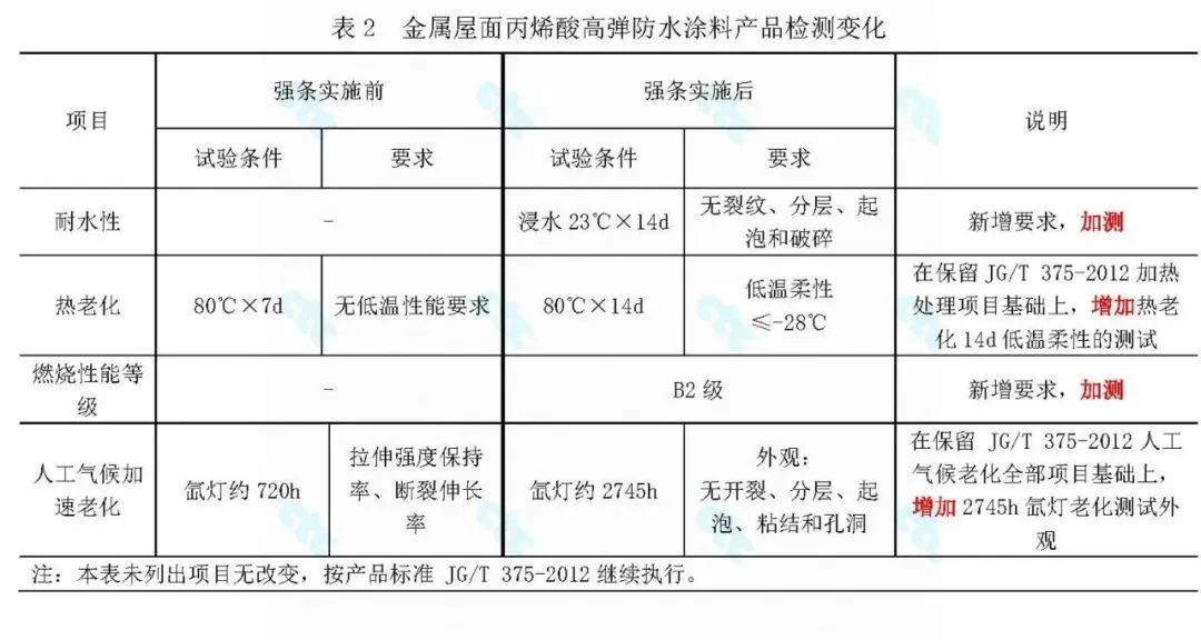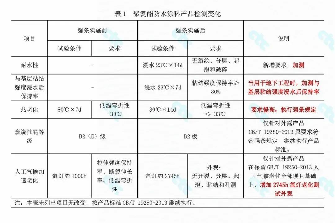 聚氨酯防水涂料(執行標準為GB/T 19250—2013《聚氨酯防水涂料》),強條實施后,防水涂料產品無需關注新提出的搭接縫性能,而應重點關注產品的影響環境物質和有害物質限量的要求。聚氨酯防水涂料有害物質執行GB/T 19250—2013《聚氨酯防水涂料》國家標準中5.3的要求,其他防水涂料則依據各自產品標準,若產品標準沒有規定時應執行行業標準JC 1066—2008《建筑防水涂料中有害物質限量》的要求。需要注意的是,防水涂料在使用過程中,還需關注使用所在地的地方標準、規章、條例和相關要求,適用時應符合產品使用所在地的環保要求。