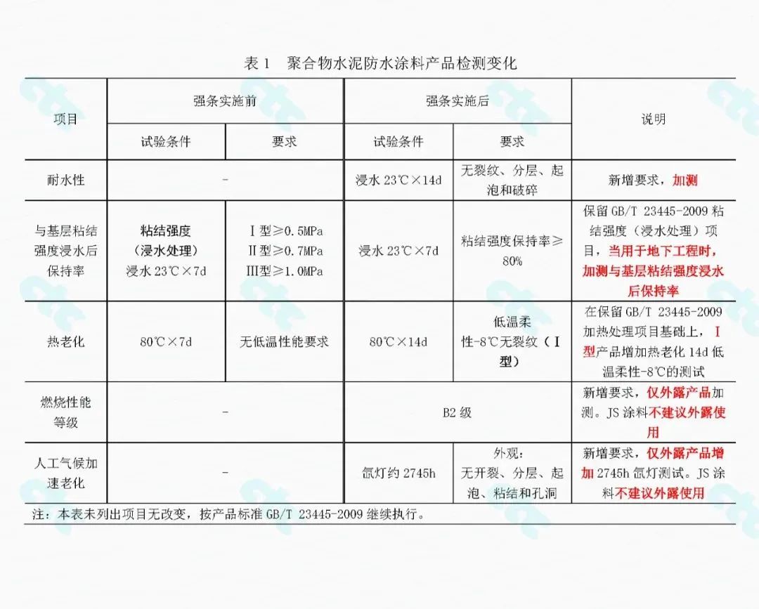 GB/T 23445—2009《聚合物水泥防水涂料》規定了“粘結強度(浸水處理)”的要求,但與強條提出的“與基層粘結強度浸水后保持率”項目并不能等同使用。要求上產品標準規定了限值,強條要求保持率;試驗方法上也不一致。強條的該項要求目前尚沒有明確的試驗方法。國檢集團蘇州公司在制定中國建筑防水協會團體標準《高耐水性聚合物水泥防水涂料》時已開展過大量基礎研究。