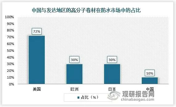 高分子防水卷材與改性瀝青基防水卷材相比,在均質性、耐腐蝕性及耐久性等方面更具有優勢,除此之外,其采用冷施工工法,具有施工速度更快、安全性更高、環保無污染等優點。當前高分子材料已成為發達國家防水市場的主流產品,其中美國防水市場中高分子卷材(包括 EPDM、PVC、TPO 等)占比達到72%,歐洲、日本市場中高分子卷材占比也達到30%,而我國防水材料中高分子卷材占比僅為10%左右。
